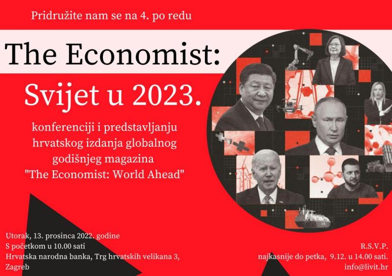 ZAGREB - Konferencija "The Economist: Svijet u 2023." održat će se 13. prosinca 2022. u svečanoj dvorani Hrvatske narodne banke. U ime organizatora Ivan Vrdoljak za Media servis rekao je da se četvrtu godinu za redom priprema hrvatsko izdanje globalnog godišnjeg magazina The Economist: Svijet u 2023. Objasnio je kojim će se temama baviti ovogodišnja konferencija.